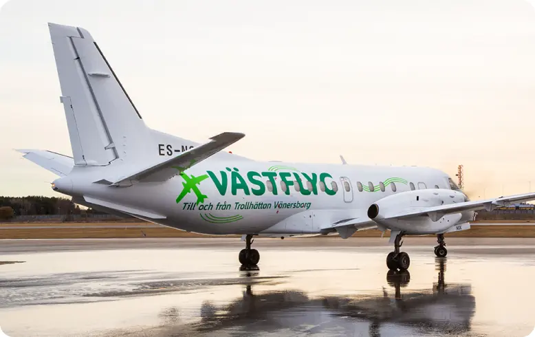 Flyg smartare till och från Göteborg Stallbacka Airport. Vi har upp till 50% förnybart flygbränsle, vilket är den högsta tillåtna blandningen idag. Satsningen gör att vi minskar koldioxidutsläppen med upp till 40%. Gör ett bättre val och upplev bekväma resor som tar oss närmare en grönare framtid.